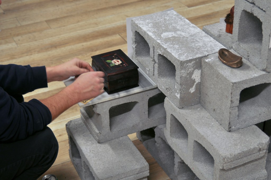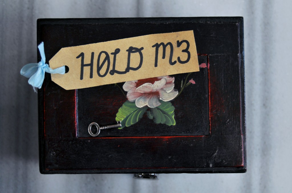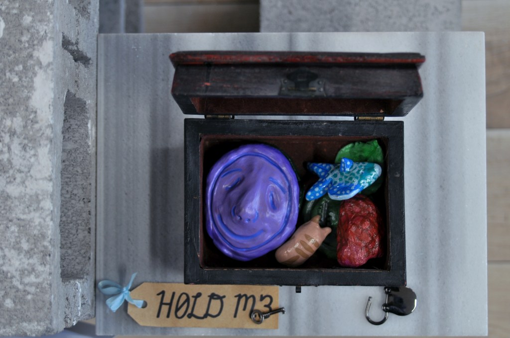 Air-dry clay, plaster, acrylic paint, gloss finish. Wooden box, metal lock and key.